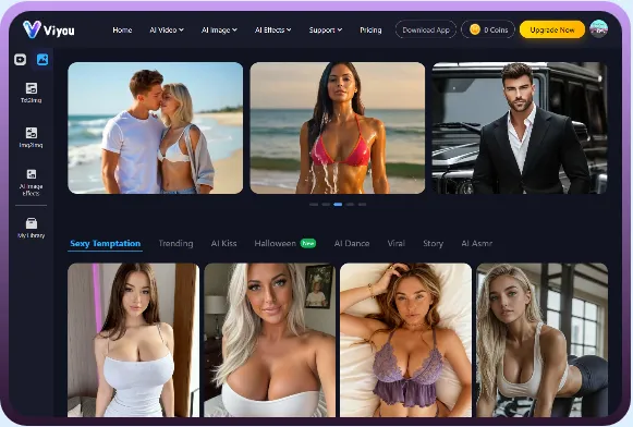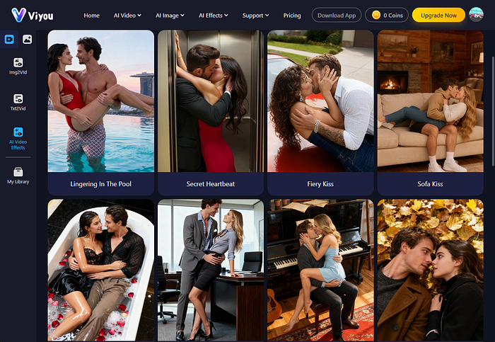 - Select a template: Pick one template from Viyou’s library, such as Sexy Temptation, AI Kiss, or AI Dance.