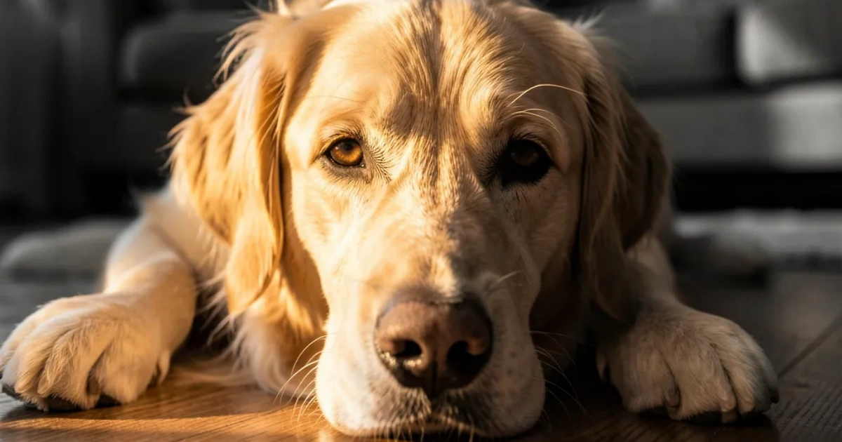 Eine Nahaufnahme eines älteren, sanften Golden Retrievers, der auf einem sonnigen Holzboden liegt. Ein Streifen warmen Morgenlichts aus dem Fenster beleuchtet sein intelligentes, freundliches Gesicht und seine weiche, grau werdende Schnauze. Aufgenommen mit einem 85mm f/1.8 Objektiv, das eine sehr geringe Tiefenschärfe erzeugt, die das gemütliche Wohnzimmer im Hintergrund in sanfte Farben verwischt. Fotorealistisch, detailliert, seelenhaft.