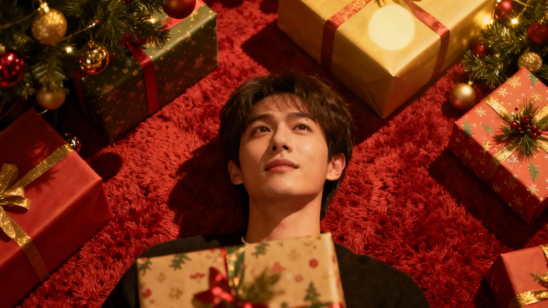 The environment is a Christmas‑decorated indoor space with a soft, plush carpet as the base. Numerous wrapped gifts are placed beside and around the subject’s body and head, reinforcing the festive atmosphere. Lighting is balanced and warm, with realistic shadows and depth. The entire image is rendered in 8K ultra‑high definition, with strict enforcement of full limbs, correct finger and toe counts, and zero body distortion for a clean, professional result.