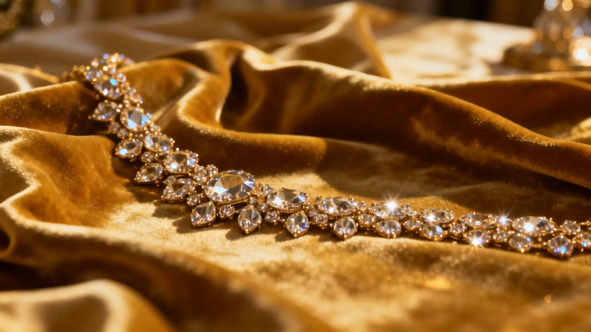 The environment is a richly decorated hall with red velvet drapes, gold columns, crystal chandeliers, disco balls, and candy cane decorations. Floating snowflakes or sparkling particles add motion to the background. Lighting is warm and golden, with soft ambient illumination and realistic highlights that enhance velvet, silk, crystal, and metal textures. The final image is rendered in ultra‑high detail, with realistic depth, dynamic background elements, and a cinematic, award‑level photographic finish.