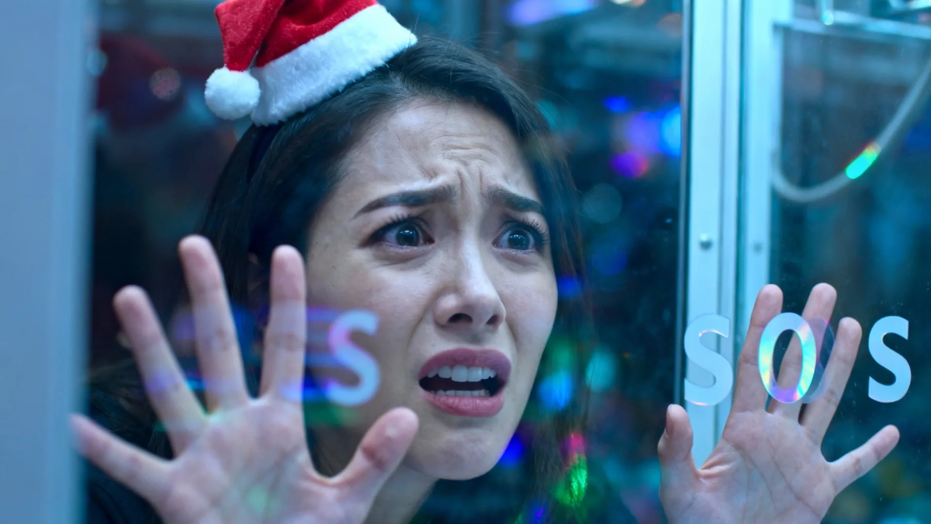 Makeup and attire are in a playful Christmas style (e.g., Santa hat, red and white color scheme). The focus is on the facial expression: possibly an exaggerated helpless look, breathing on the glass to write, or a playful SOS gesture, emphasizing the humorous aspect of the scene.