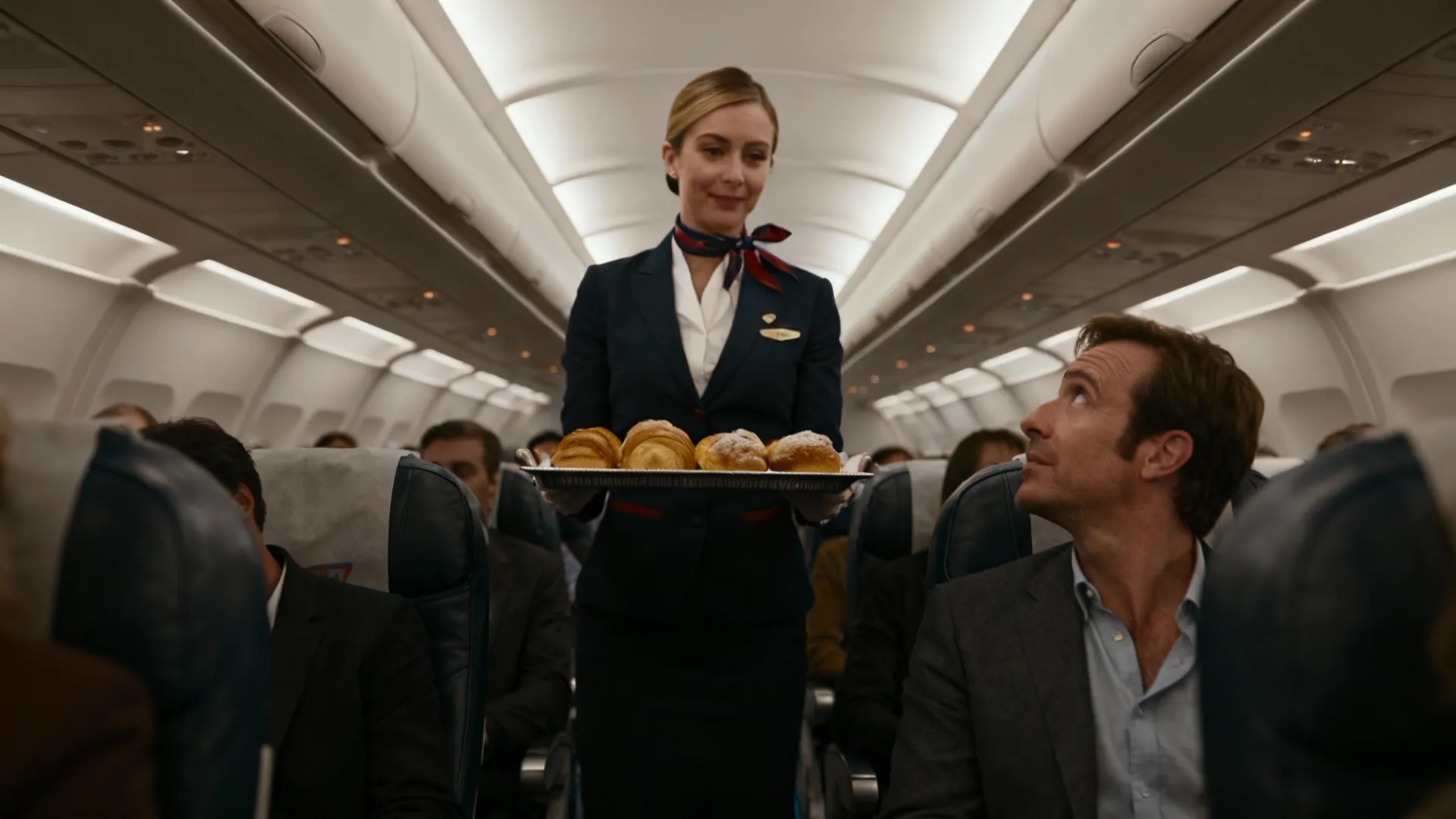 The airplane cabin acts as a pressure chamber. Background passengers remain present but secondary, heightening tension as intimacy unfolds in a space not meant for it.