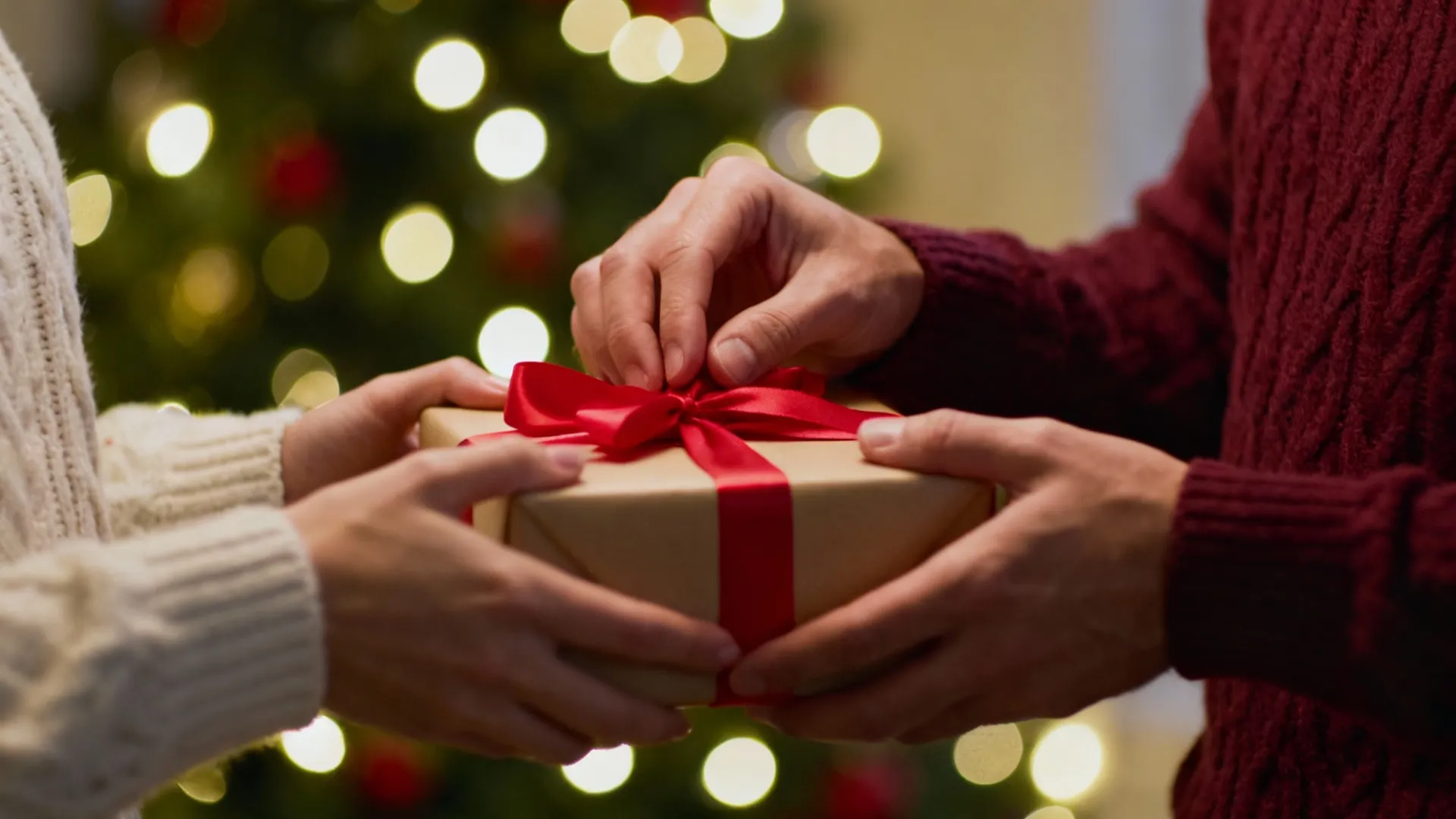 Emotion is expressed through small, meaningful gestures: exchanging ribbon‑tied gifts, brief fingertip contact, and close framing. Shallow depth of field isolates these moments, reinforcing intimacy and warmth.