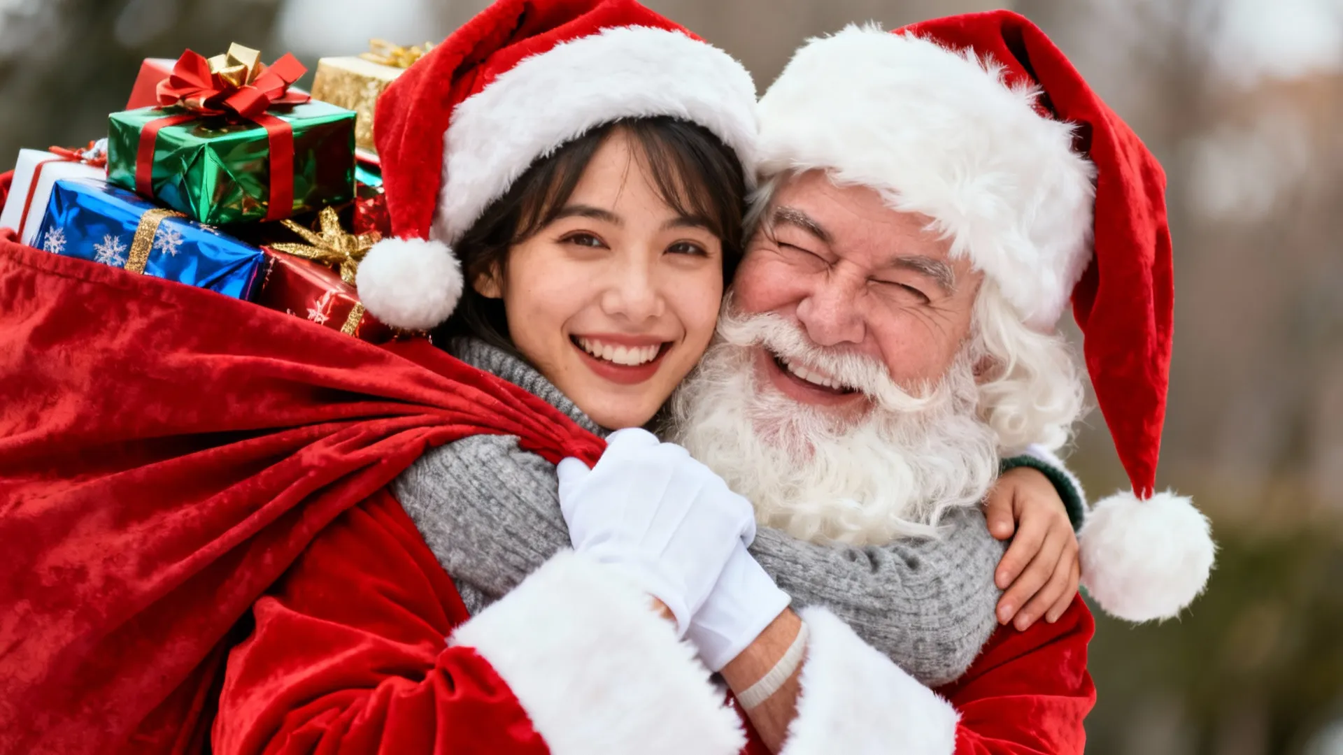 AI captures and optimizes the intimate gestures and sense of gratitude between the user and Santa. Posture rendering includes the user gently leaning toward Santa, Santa kindly turning sideways, or the user reaching out to hug Santa, creating a fairy-tale sense of warmth.