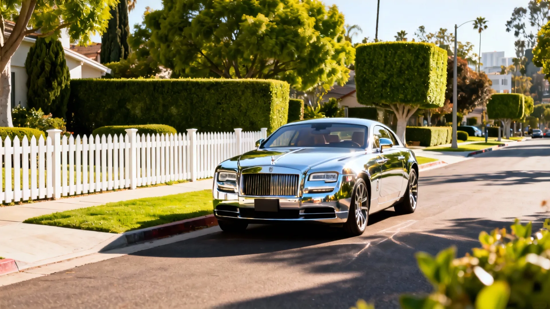 The scene is a lush suburban street with white fences and manicured lawns. The core prop is a high-end luxury car. The camera uses a slight low-angle narrative perspective, emphasizing the car's volume and the subjects' dominant posture.