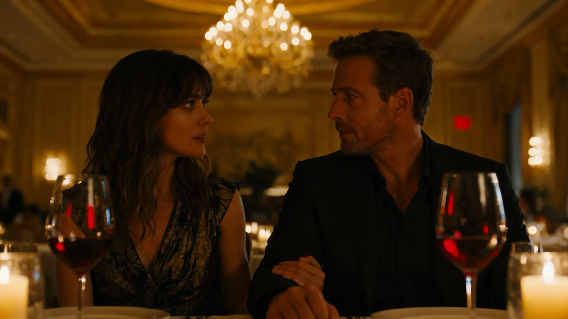 The restaurant scene focuses on dramatic chandelier lighting, reflective surfaces, and quiet intimacy. Emotion is conveyed through eye contact, touch, and whispered dialogue, while fine visual details—fabric texture, glass reflections, and skin highlights—anchor the realism.