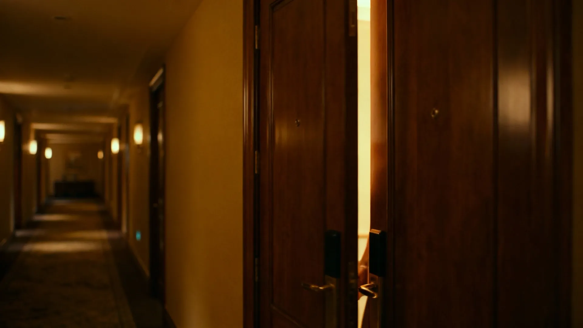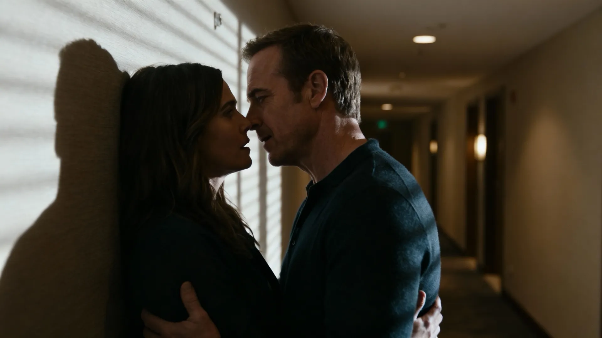 In transitional spaces like hotel hallways, physical closeness replaces dialogue. Characters move into each other’s space slowly, creating tension through breath, shadow, and restrained motion rather than overt gestures.