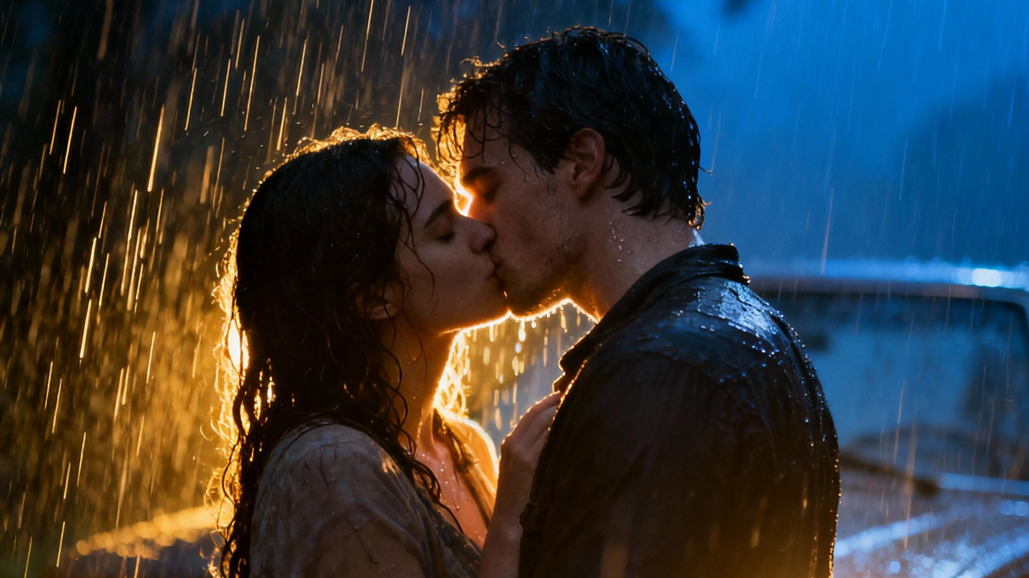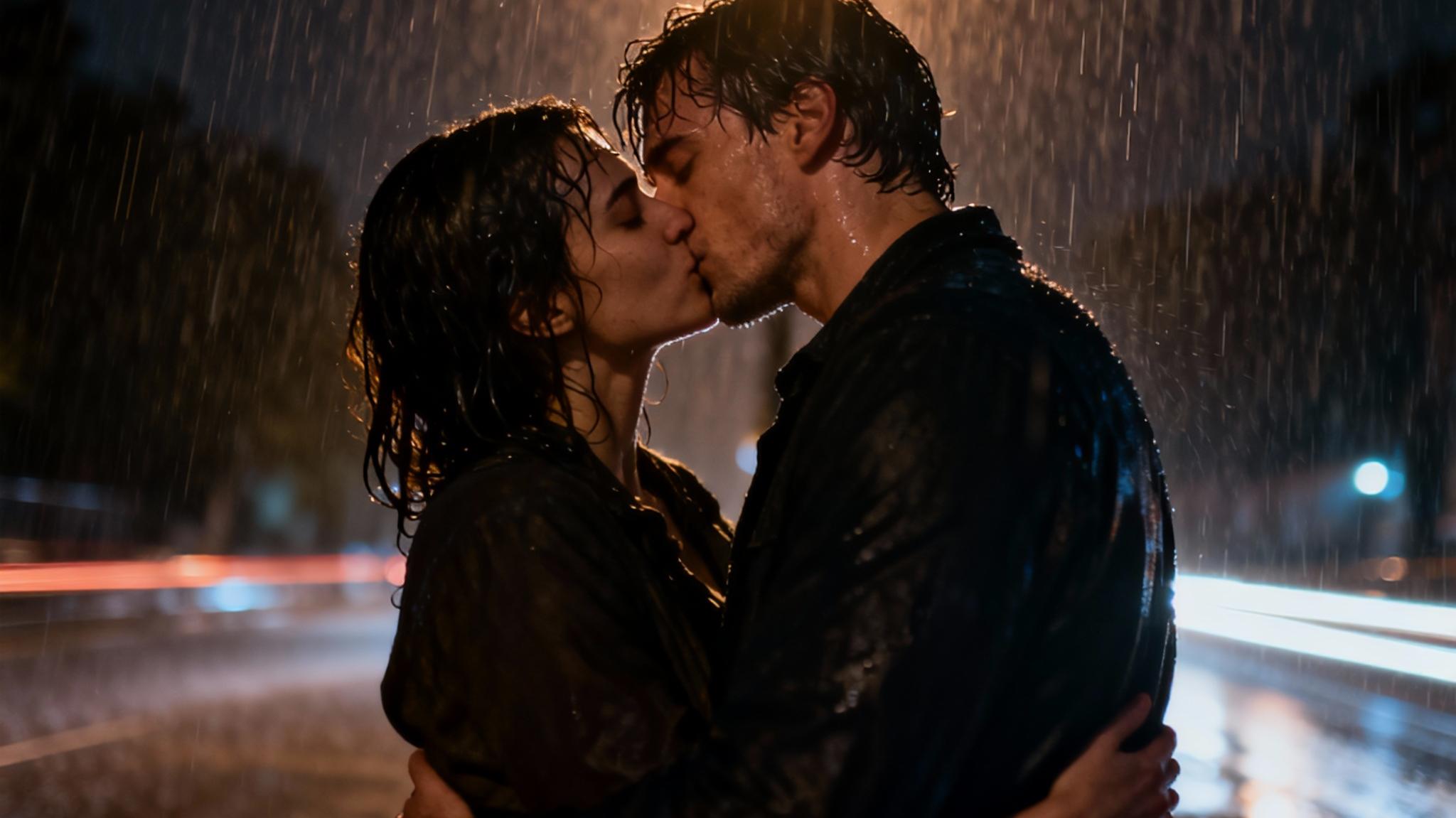 Against the backdrop of rain (visually implied), the lens focuses on the tight embrace. The intelligent algorithm captures the focus and depth of "a storm outside, but only us right now," using slow-motion close-ups to amplify the firmness and intensity of love.