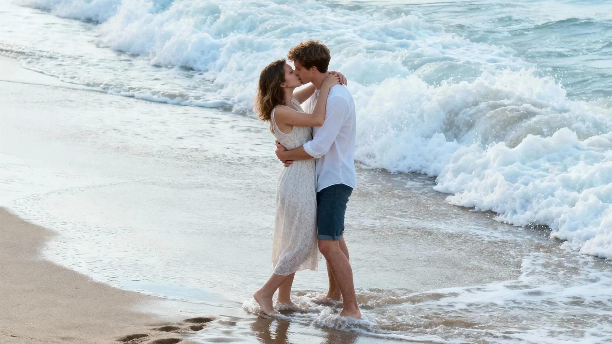 The AI intelligent algorithm integrates dynamic natural elements—gentle waves, flowing hair, and delicate sand textures—into the frame. The video utilizes slow motion and close-ups to emphasize the dynamic beauty of the background, showcasing a fresh romance that feels like an eternal vow, letting every deep kiss be accompanied by the rhythm of the waves.